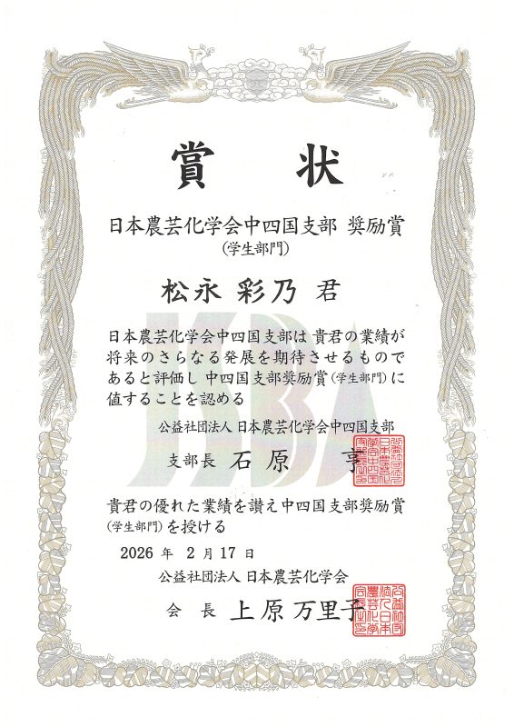 令和8年2月17日(火)、農林海洋科学部4年の松永彩乃さんが、日本農芸化学会中四国支部奨励賞(学生部門)を受賞しました。