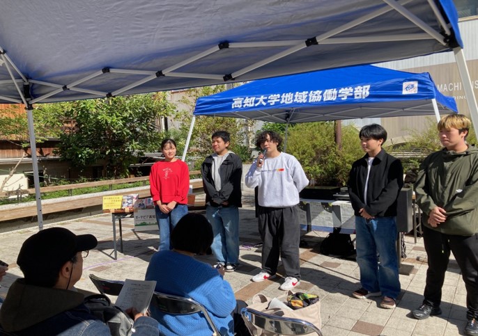 会場は高知市中心商店街の帯屋町公園。高知市の協力のもと、公園の無料使用や近隣の音楽喫茶の駐車場の提供を受け、さらにオーテピア図書館職員による音楽資料紹介も加わるなど、まちぐるみのコラボイベントとなりました。