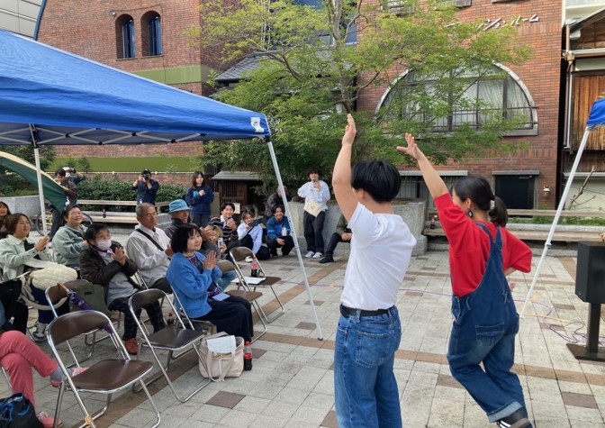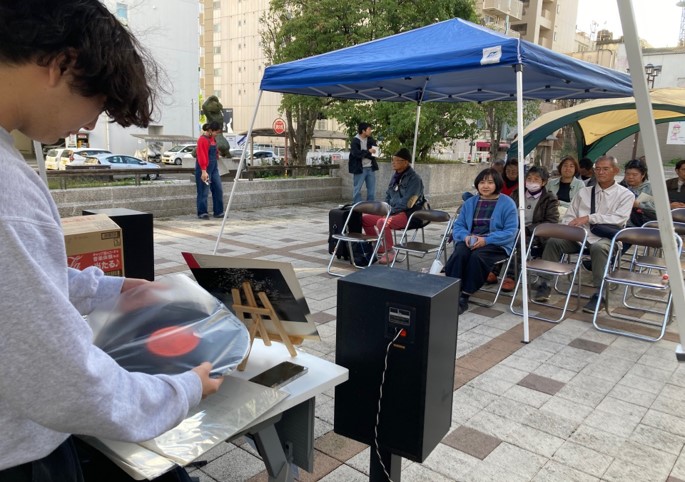 学生たちは早朝から会場設営を行い、強風にテントやレコード針が飛ばされないよう注意を払いながら運営。秋晴れの下、街ゆく人々と音楽を通じて穏やかで楽しい時間を共有しました。