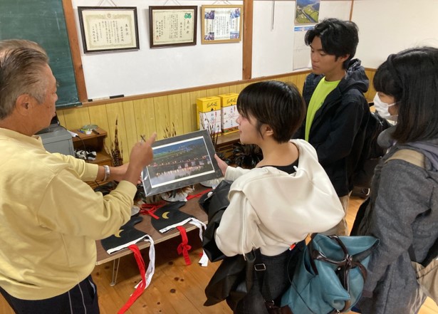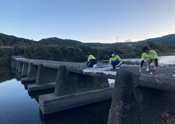 開催前には、若井地区の津末区長から、かつて松明で沈下橋を照らした地域の取り組みについて話を伺い、四万十川とともに歩んできた地域の歴史に触れました。その後、学生3名と教員、四万十町の職員を合わせた6名で、約2,500個のLEDライトを河原や橋の上に敷き詰める作業に取り掛かりました。
