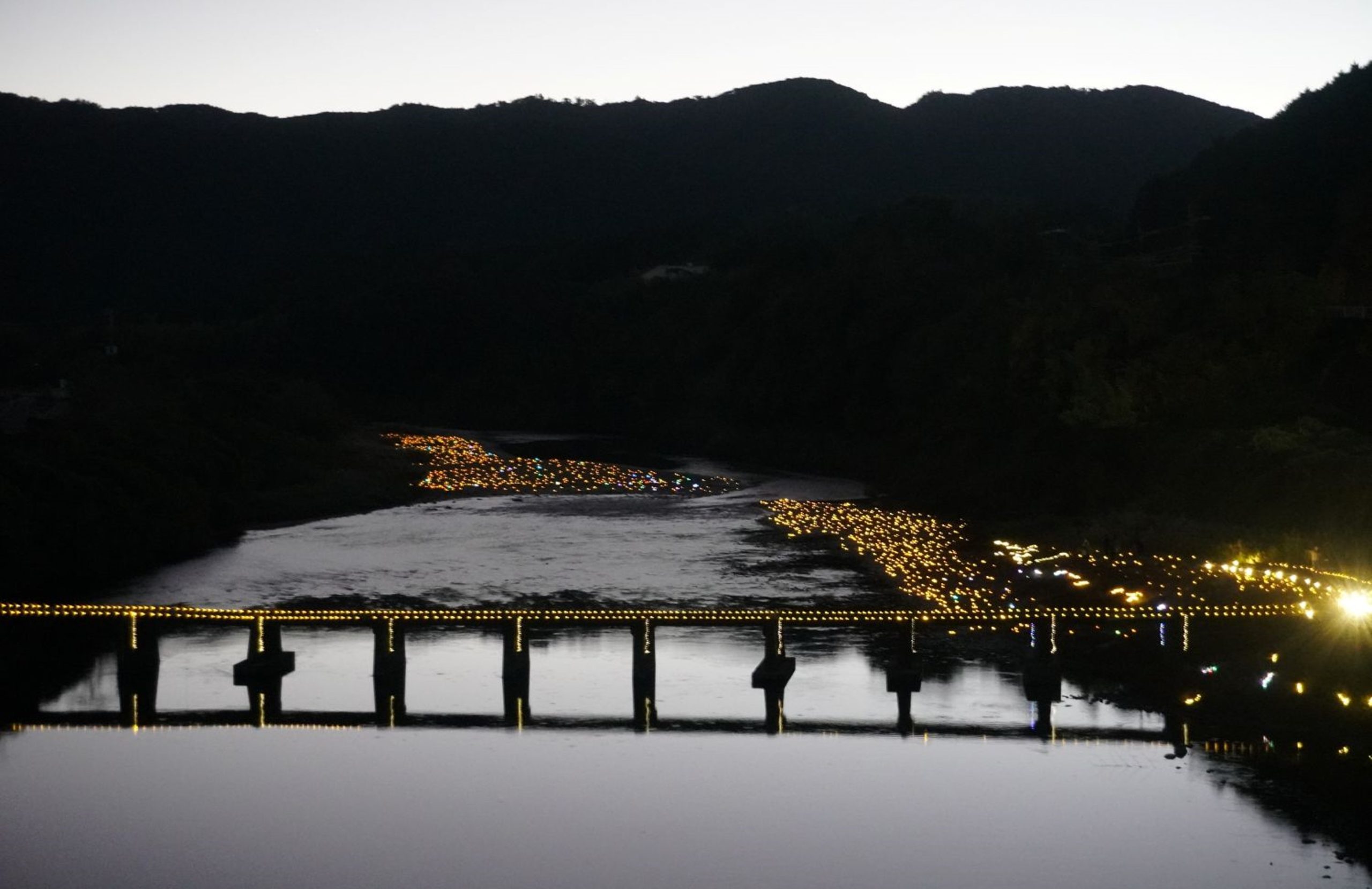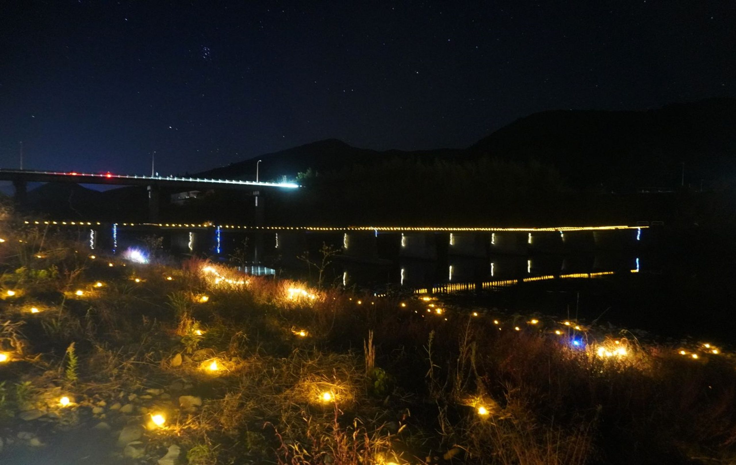 夕暮れが近づくとともに灯りがゆっくりと浮かび上がり、沈下橋から川面へとつながる光が、まるで天空の天の川と一体となるように広がりました。