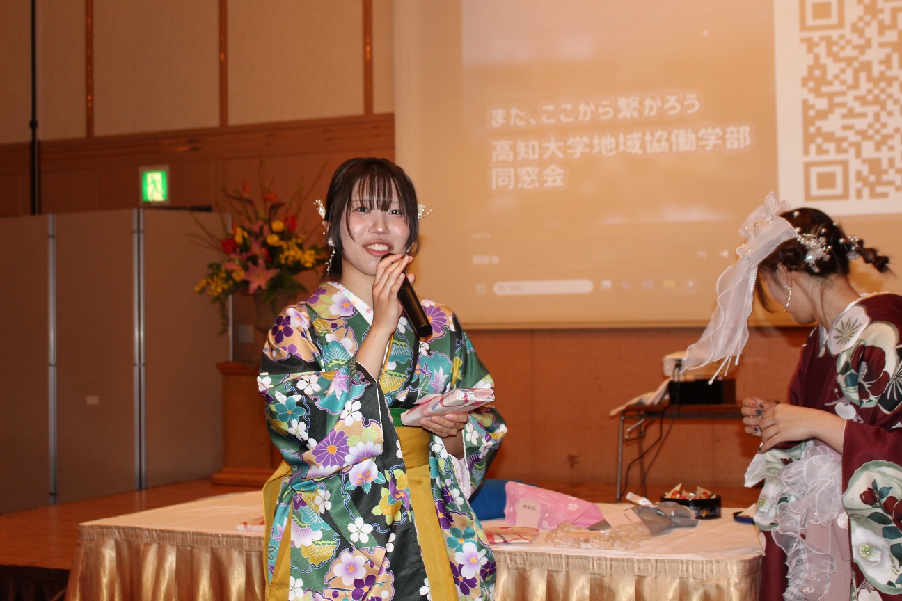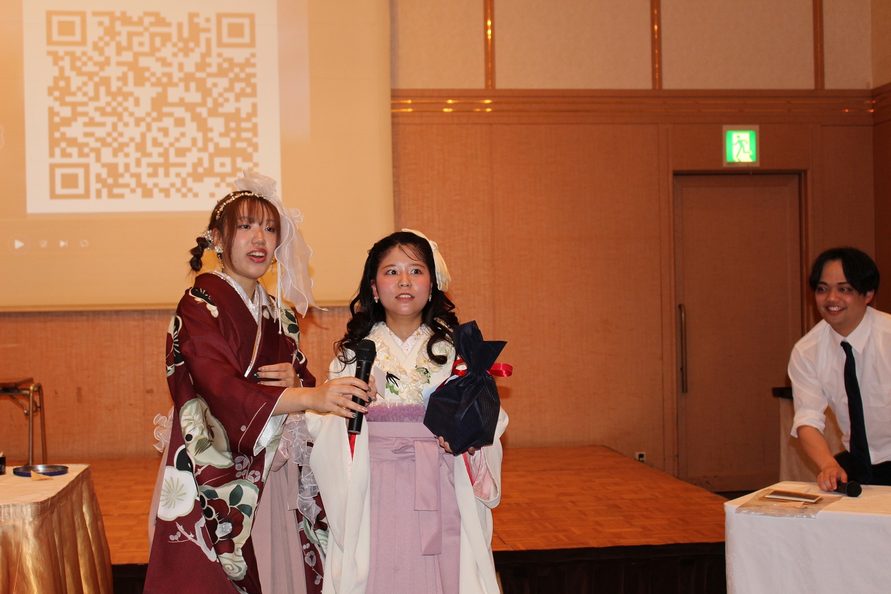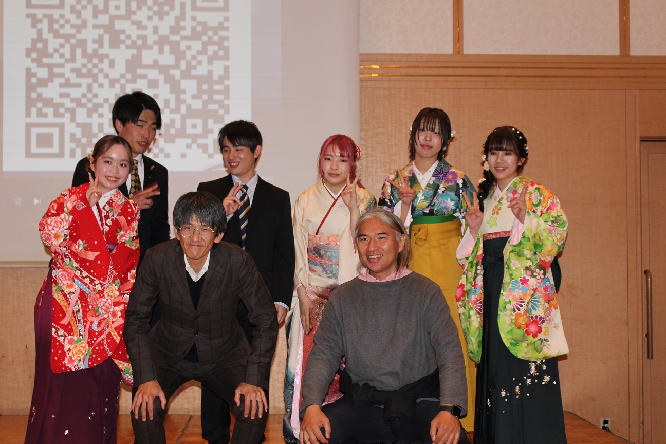 祝賀会は、式場から移動してきた晴れ姿の卒業生たちで華やいだ雰囲気に包まれました。地域協働学部恒例となっている、教員から提供された景品によるお楽しみ抽選会なども行われ、大いに盛り上がりました。