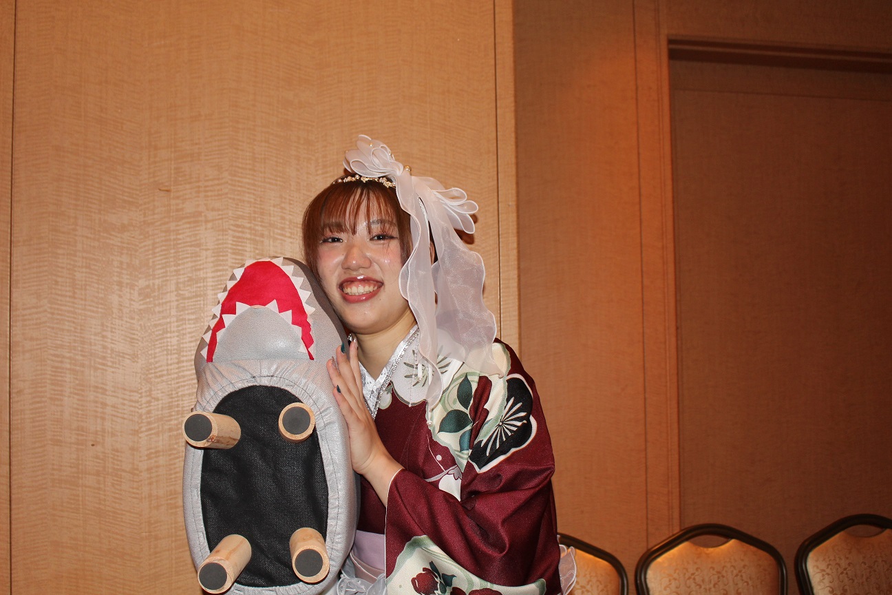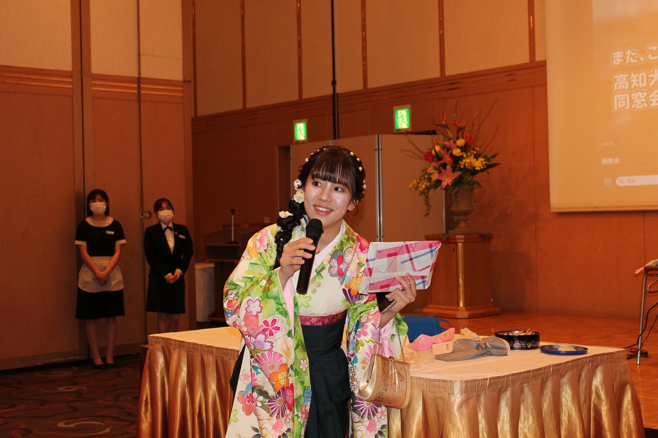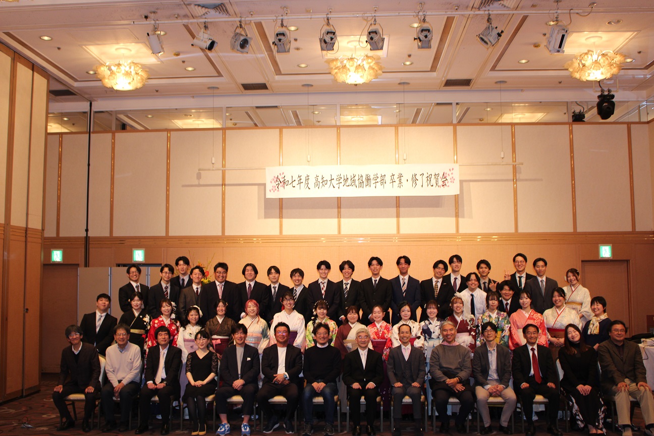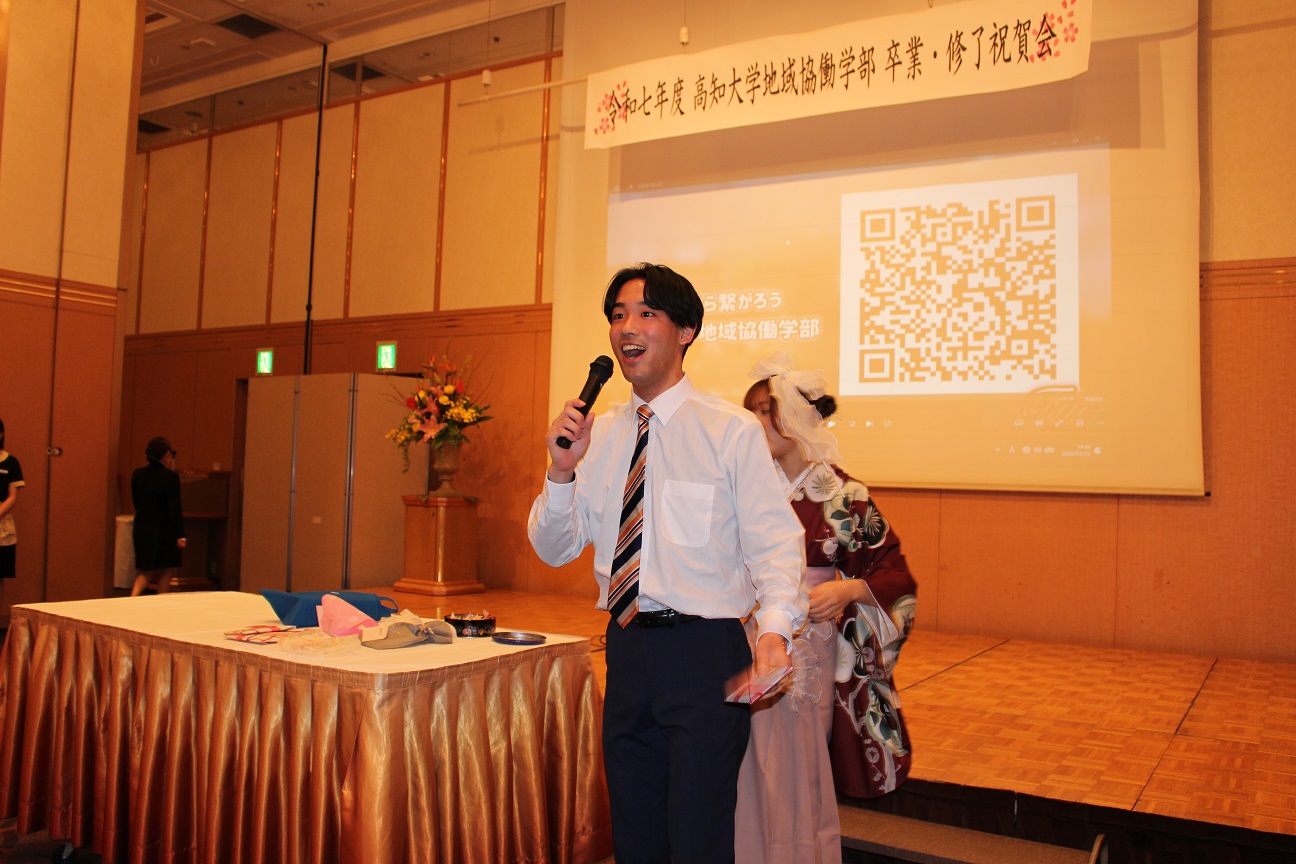 祝賀会は、式場から移動してきた晴れ姿の卒業生たちで華やいだ雰囲気に包まれました。地域協働学部恒例となっている、教員から提供された景品によるお楽しみ抽選会なども行われ、大いに盛り上がりました。