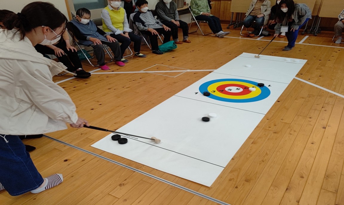 午後からは、石原の集落活動センターいしはらの里で行っている「あったかふれあい広場」に参加させていただきました。参加者の方々は、学生が教室に入った瞬間から暖かく迎え入れいただき、学生側も緊張せずに楽しく行うことができました。 準備体操の後はレクリエーションとして、スライドカーリングとボッチャを、地域の方と学生の対戦形式で行いました。どちらの競技も初体験でしたがとても楽しく、地域の方々ともしっかりと交流することができました。笑顔と笑い声で溢れる場の雰囲気がとても印象的でした。どちらの競技でも、お互いに教えあい、応援しあう様子が見られ、このような素敵な関係性を様々な場所へと広げていきたいと思いました。