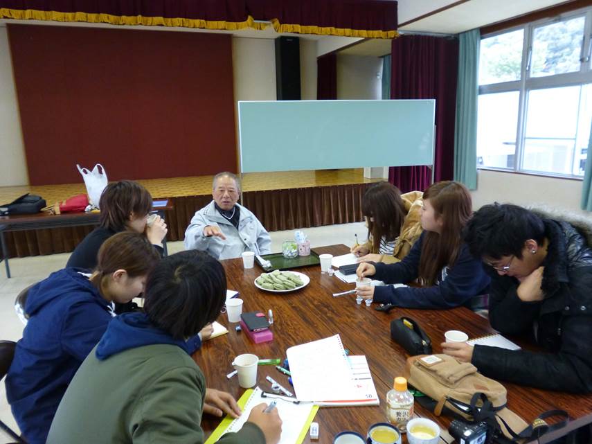 その後は報告内容もふまえ「長者の魅力・課題・可能性」について、学生と地域の方々が5人一組の4つのグループに分かれ、話し合いを行ないました。学生にとっては地域の方々の声を自分たちで聞けるまたとない機会で、どのグループも活発な話し合いになり、長者地域の状況や人々の想いに関して、学生たちは多くの気づきを得たようでした。