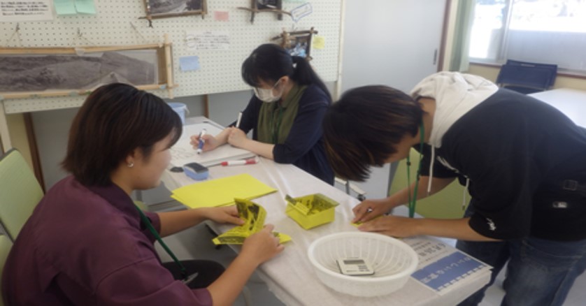 開場すると、地区の方や地域の方、そして夏休みとあって、親子連れの方々も次々とご来場。学生たちが担当したのは、フィッシング体験と流木・木工・シーグラスを使ったオブジェづくりの指導補助でした。木工を手掛ける山本さんによる柔らかなバネの刺さった海の生き物を象った木工品や流木に、シーグラスや小さな石を木工ボンドで接着し、バネを流木に空けた穴に刺したら完成です。木工品にシーグラスや石をくっつけるときのバランスや量が、自立するオブジェになる上ではポイント。小学校低学年位のお子さんにやり方を指導しつつ、学生たちは褒めて伸ばそうとしていました。