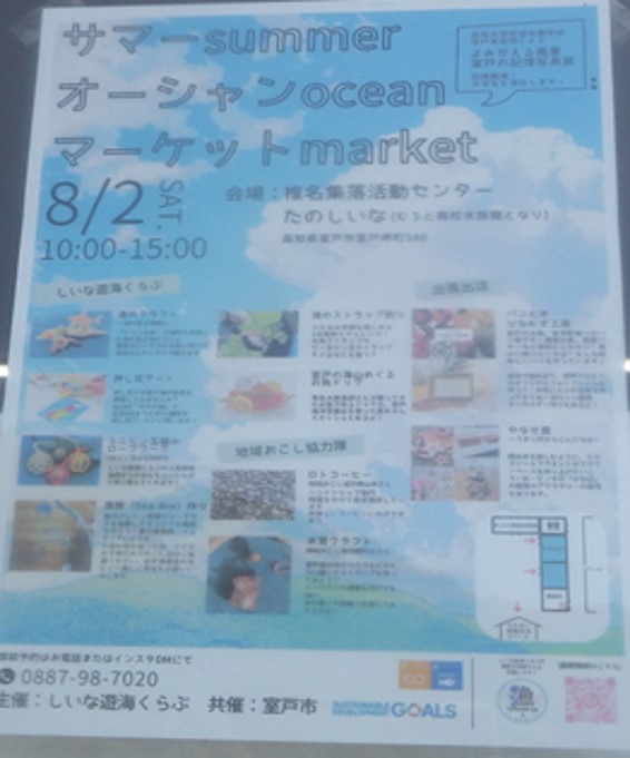 試験期間に入った夏真っ盛りの8月2日、室戸を主とした漁村のくらし実習班は、椎名集落活動センターに向かいました。この日は、しいな遊海くらぶ主催の「サマーオーシャンマーケット」のお手伝いを兼ねた、写真展の案内と聞き取りです。