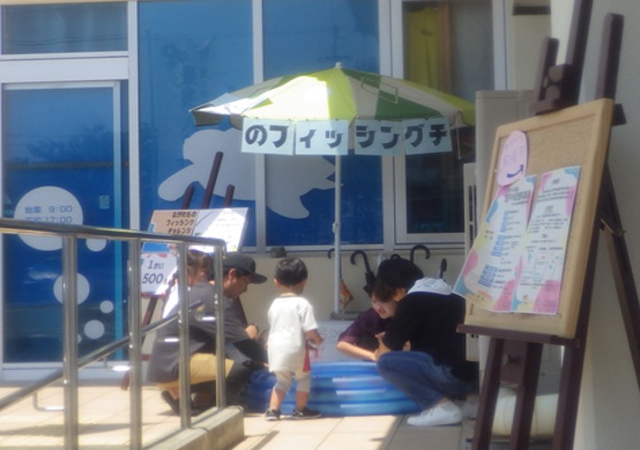 フィッシング体験では、制限時間内に釣れたグッズの数で、景品が決まります。水を張ったビニールプールに浮かせたものを、1分間にどれだけ釣ることができるか。幼い子には釣り竿が使いやすいようハンディをつけて、応援しつつタイムキープし、終えたら景品場にお連れして選んでもらいます。小さな子と目線を合わせながら話す学生たちの様子は、いつもよりお姉さんらしく見えました。