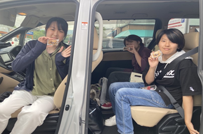 この日はお忙しさでてんてこまいだったはずの「たのしいな」のみなさんにもお気遣いいただき、特製お魚ドッグや夏みかんスカッシュを出してくださったり、パンを差し入れてくださいました。さらには「体験もしてみますか?」と言っていただき、学生たちは押し花と悩みつつ全員ビン玉ロープワークを選択。いつもお世話になっている漁師の安岡さんや川田さんに教えを乞い、かわいいビン玉編を仕上げた様子は嬉しそうでした。