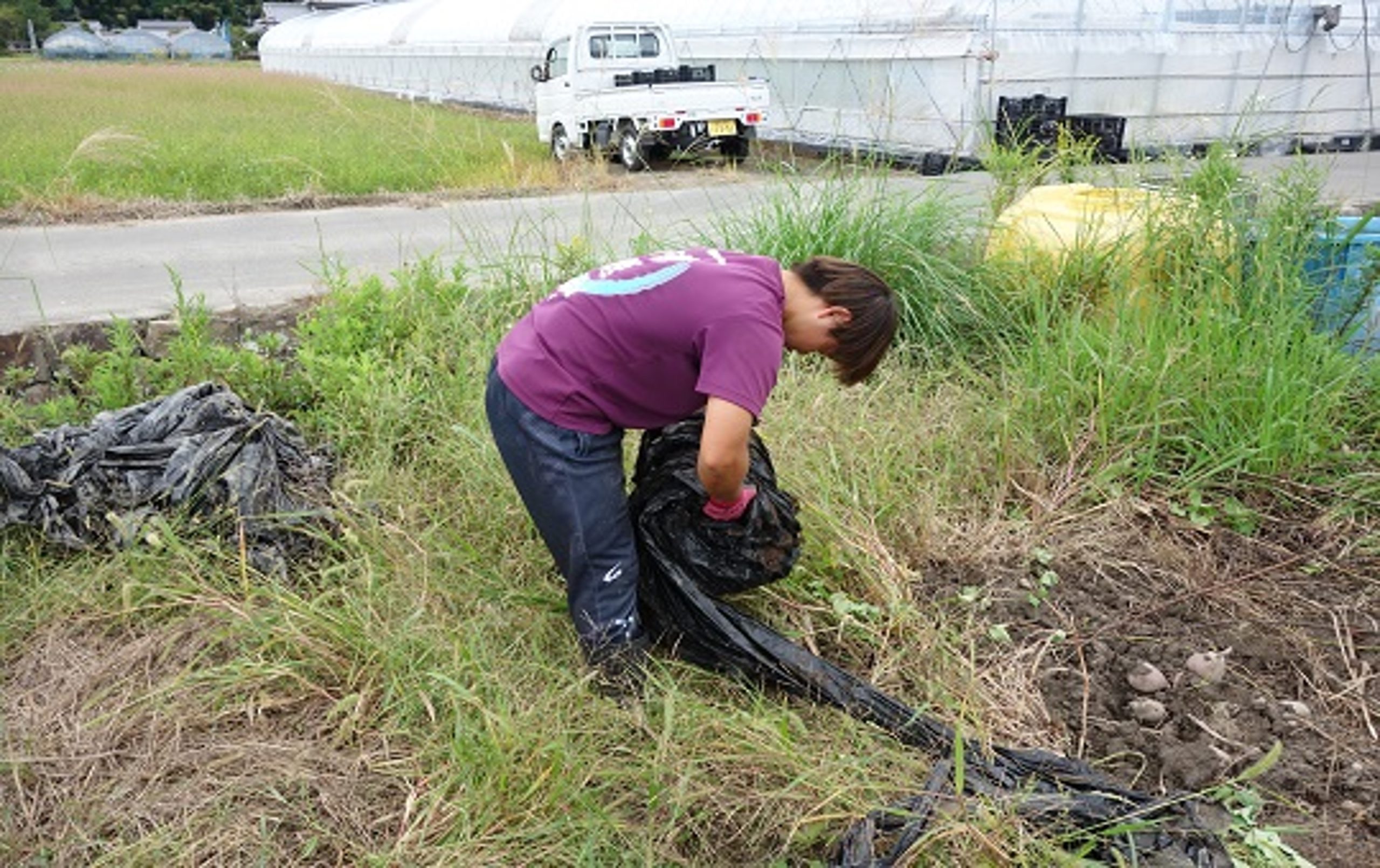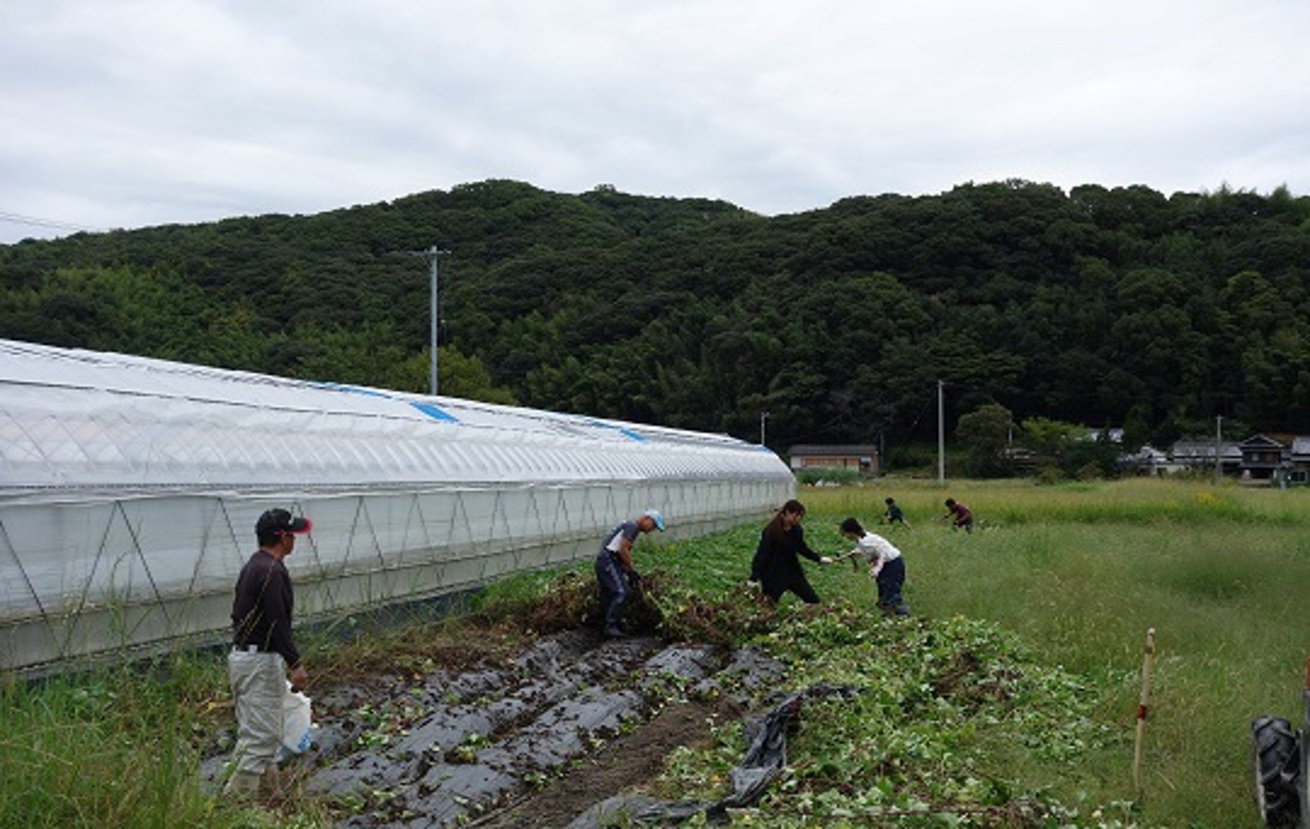 5月27日に苗を植えたサツマイモは、地域の岩田さん・川崎さんの力を借りながらすくすくと成長。この日は、まず蔓を切り取り、マルチ(雑草抑制等のために土壌表面を被覆したフィルム)を剥がし、農具を使って掘り起こす作業を行いました。