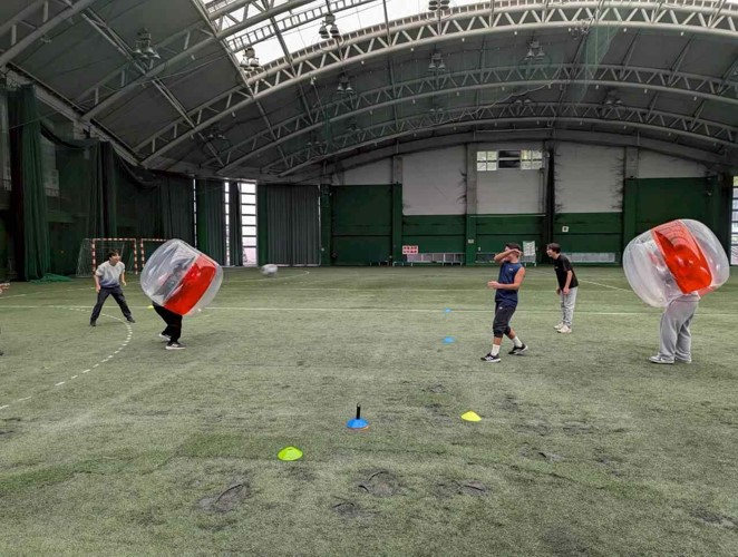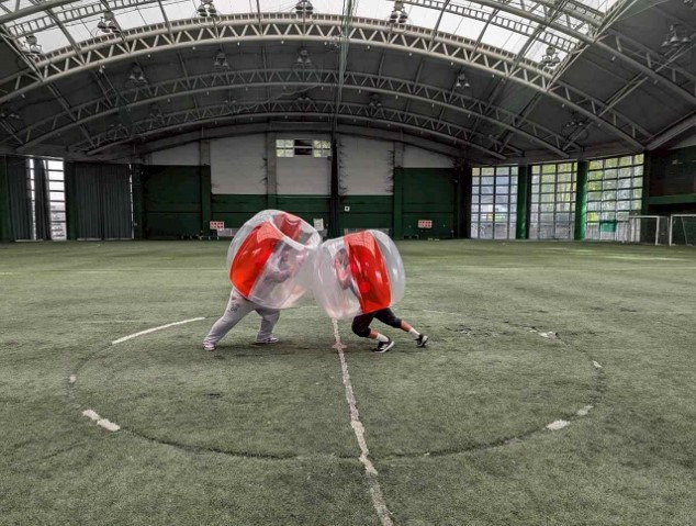 この日は、バブルボールを身にまとって挑む「バブル縄跳び」「バブルドッジボール」「バブルPK」「バブル相撲」などを体験しながら、大会本番を想定したルールづくりや安全対策、運営方法の確認を行いました。