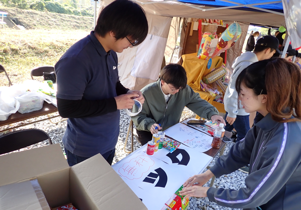 お祭り会場には、地域を盛り上げる企画が多数集まっており、学生たちは自分たちのブース運営に取り組みつつ、ほかの企画にも積極的に参加しました。