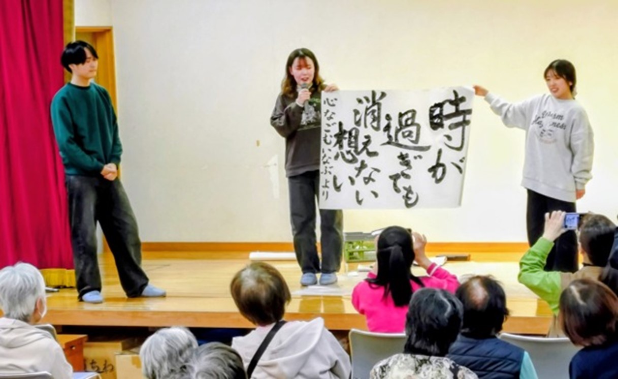 HOME > 学部からのお知らせ > 授業風景 > 「心なごむ稲生」で書道パフォーマンス!文化祭に参加しました(南国市稲生実習班) 「心なごむ稲生」で書道パフォーマンス!文化祭に参加しました(南国市稲生実習班) 授業風景2025年11月26日 11月22日、稲生ふれあい館で「稲生文化祭・舞台の部」が開催されました。 稲生実習班は、稲生テーマソング『心なごむ稲生』に合わせて書道パフォーマンスを披露しました。ステージでは、曲の一節である「時が過ぎても 消えない想い」の文字を力強く書き上げ、会場からは大きな拍手が送られました。 また、会場内には学生が制作した書道作品やイラスト・さしこ刺しゅうも展示され、地域の方々が足を止めて見入る姿が見られました。 Tweet < 前のページヘ 次のページヘ > サイトマップ プライバシーポリシー