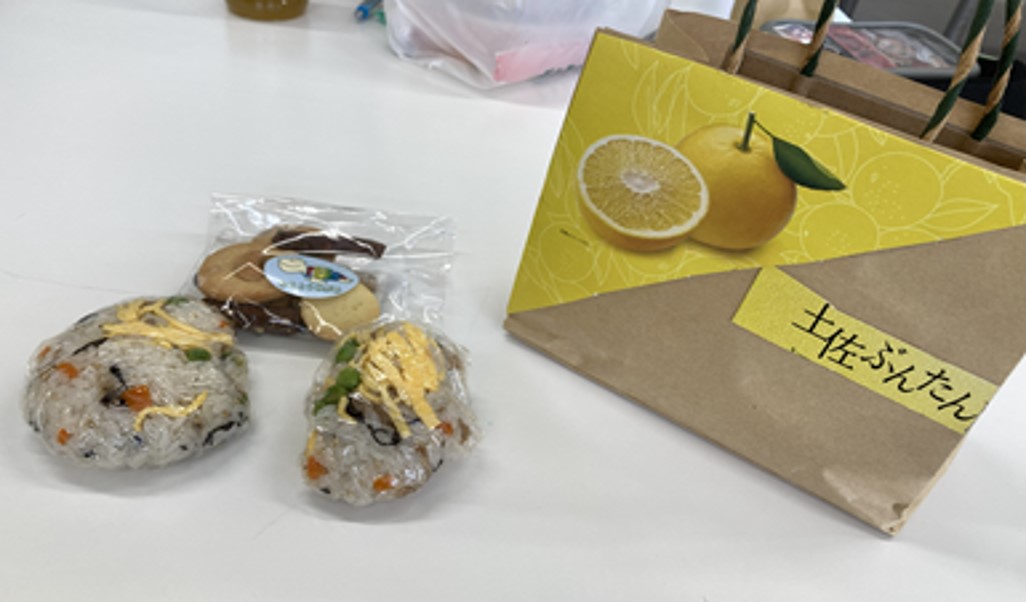 また、Tさんのご友人Kさんからは、手作りのちらし寿司おにぎりやむろとうみがめさんのクッキーを、かわいい紙袋に入れてたくさん差し入れていただき、学生たちは胸を熱くしていました。