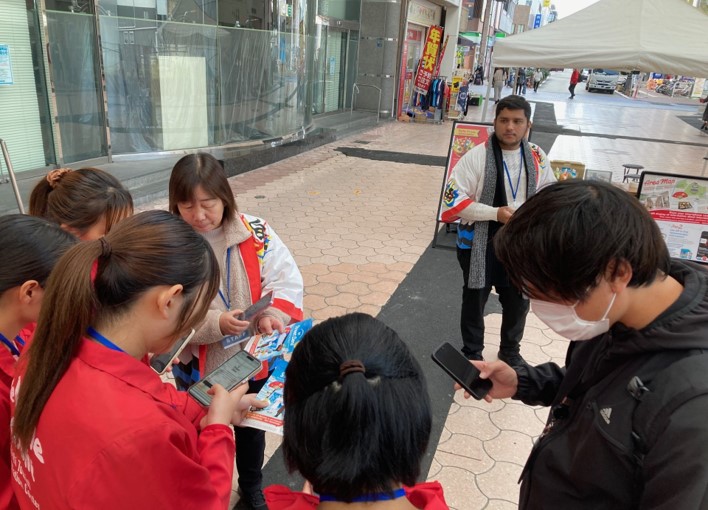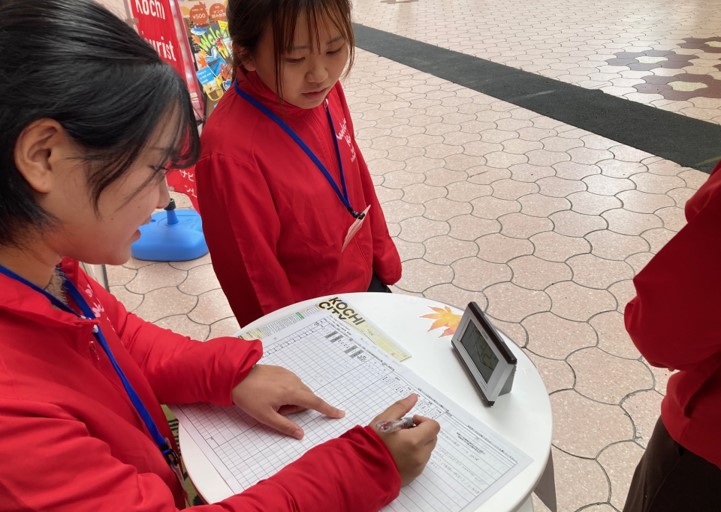 ツーリストセンター実習班の学生たちは、これまでの経験から外国語での問い合わせ対応にもすっかり慣れ、身振り手振りを交えながら目的地を案内。観光客とのやりとりを楽しみつつ、着実に対応力を伸ばしています。