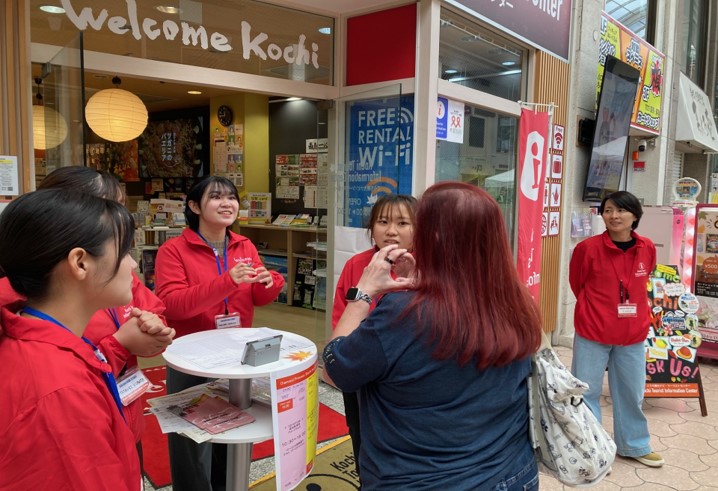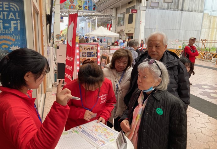 四国運輸局による案内アプリの紹介ブースや、デパート前のお茶会など、商店街のあちこちで歓迎イベントが開催され、観光客であふれていました。
