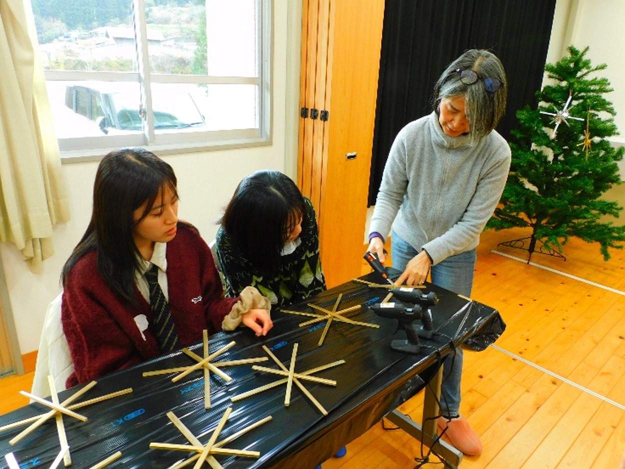 午前中は、地域の方に作り方を教わりながらオーナメントづくり。自分たちの飾りだけでなく、後日地域の方や子どもたちも飾りつけができるよう、たくさん制作しました。
