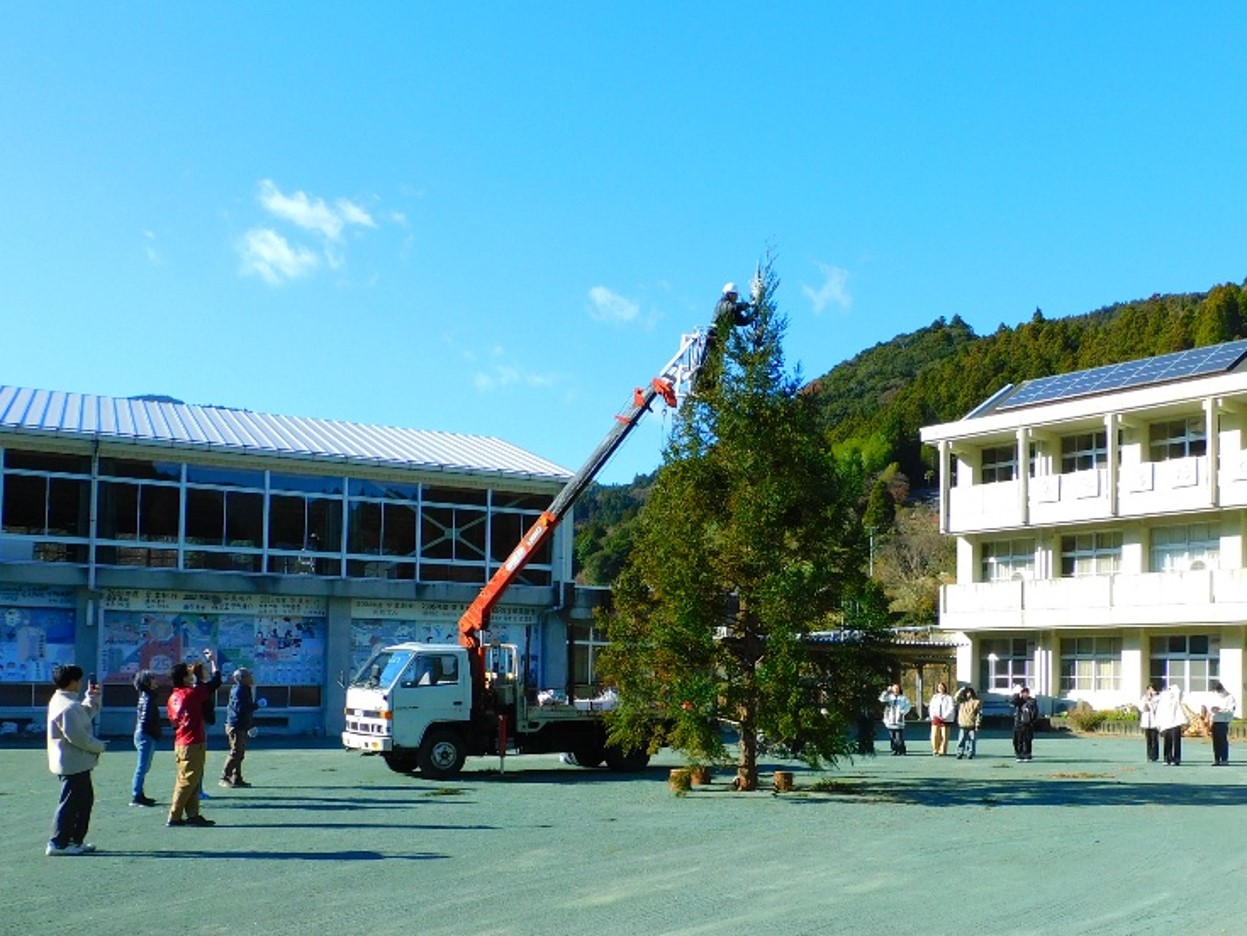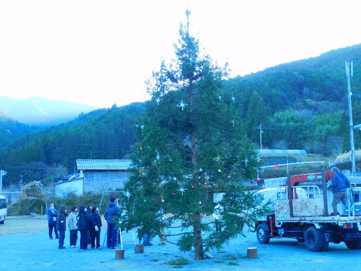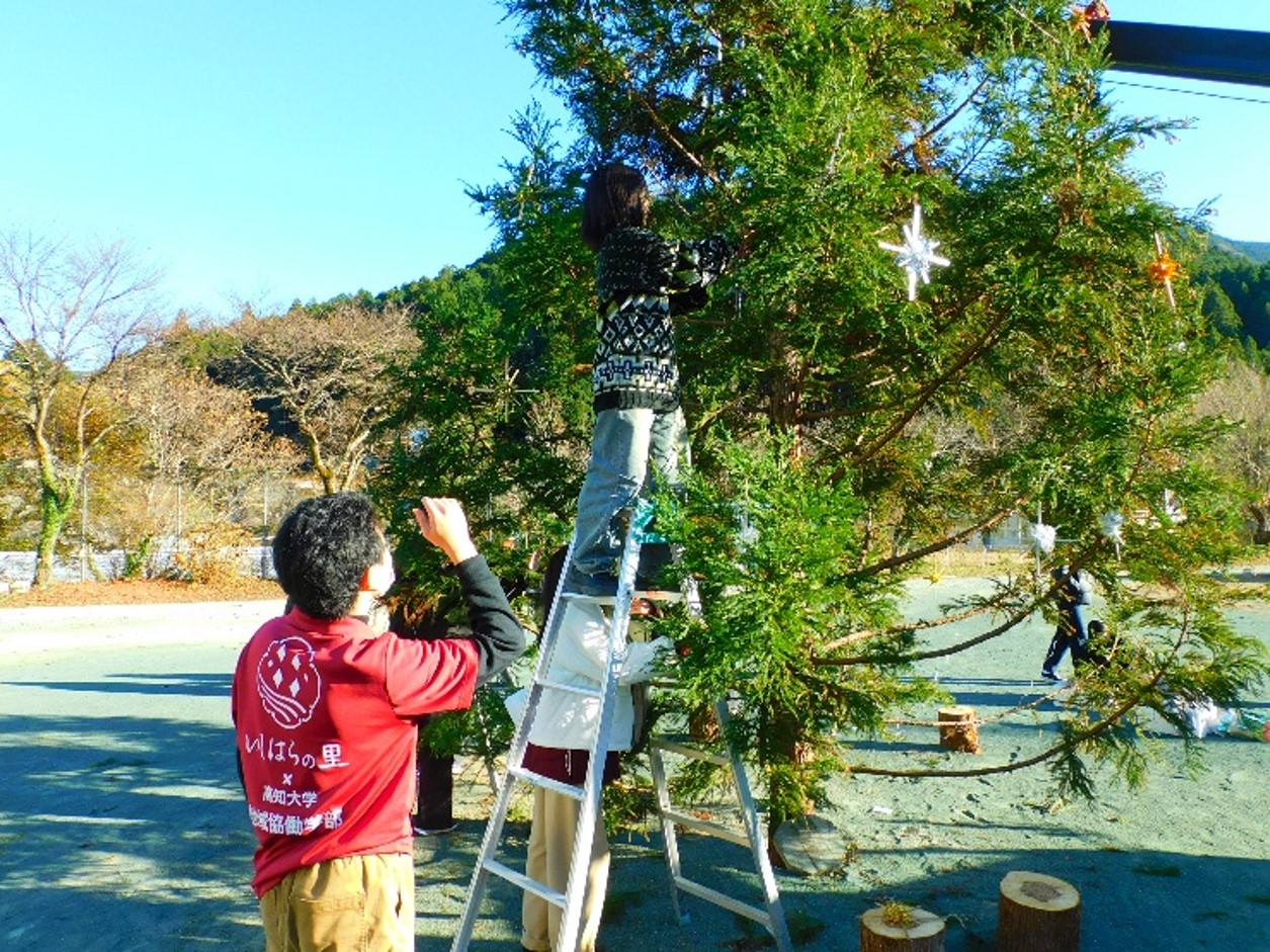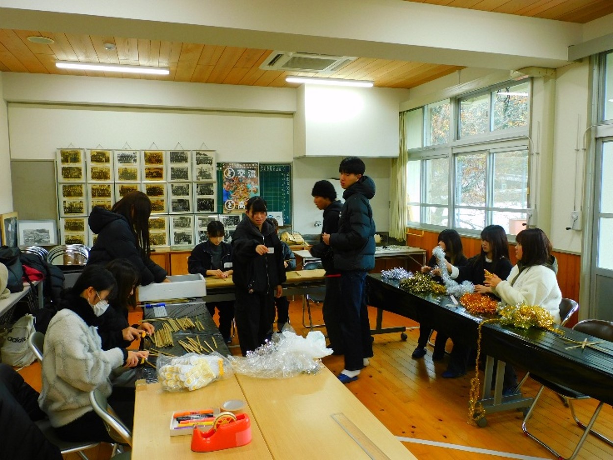 12月5日、土佐町いしはら実習班は、冬の恒例行事となっているクリスマスツリーの飾りつけを行いました。ツリーは毎年、集落活動センター「いしはらの里」に設置されており、今回は2年生の企画のもと、1年生10名も参加し、飾りづくりと装飾作業に取り組みました。