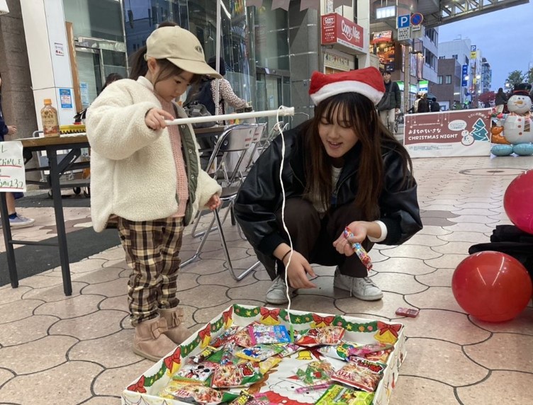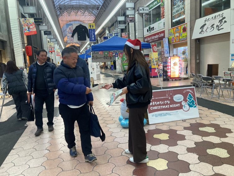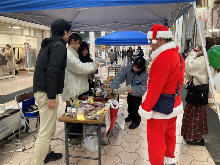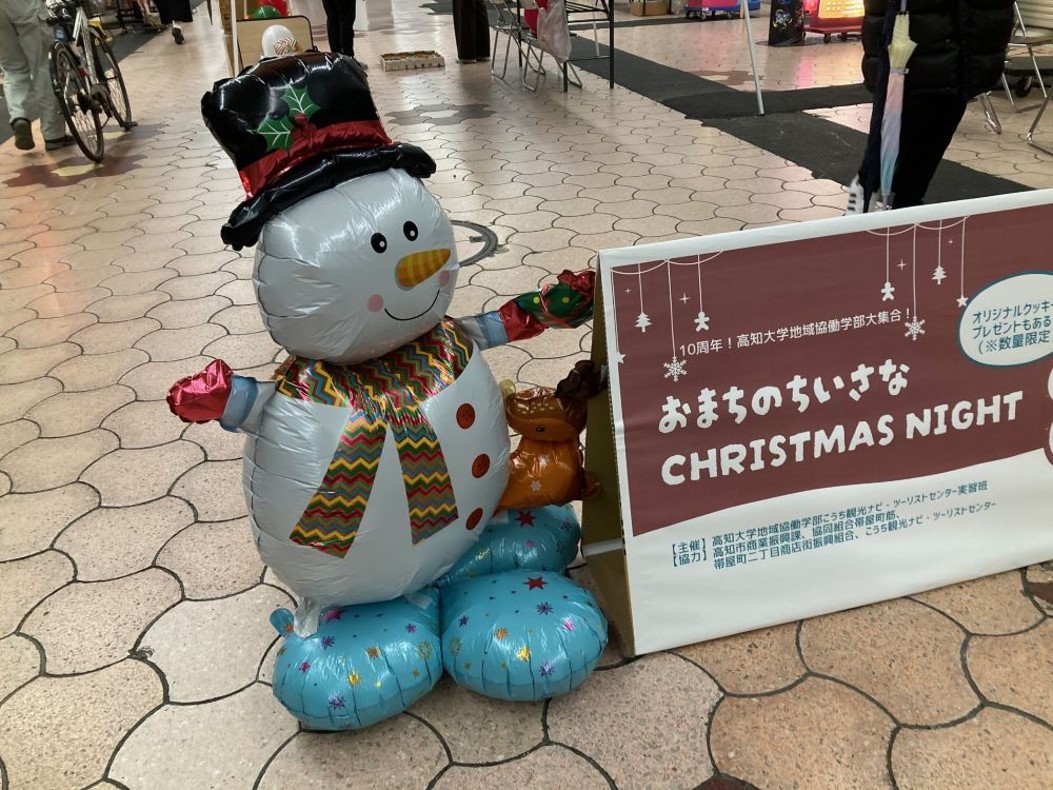 ツーリストセンター実習班3年生が中心となり企画した「おまちのちいさなChristmas Night」を、12月13日(土)に帯屋町二丁目アーケードで開催しました。学部10周年を記念し、実習地の活動紹介とともに、商店街でクリスマスのひとときを楽しんでもらうことを目的としたイベントです。