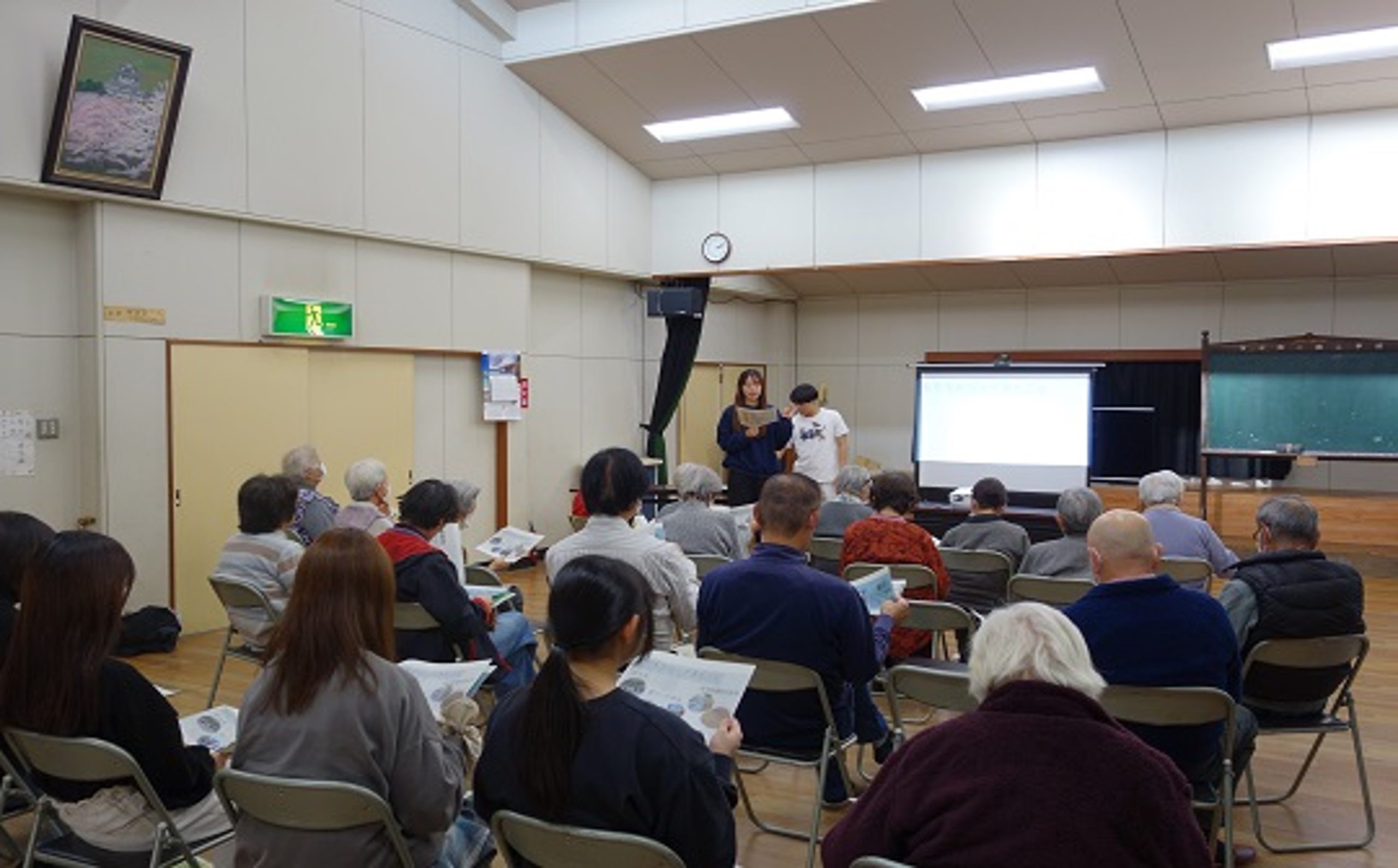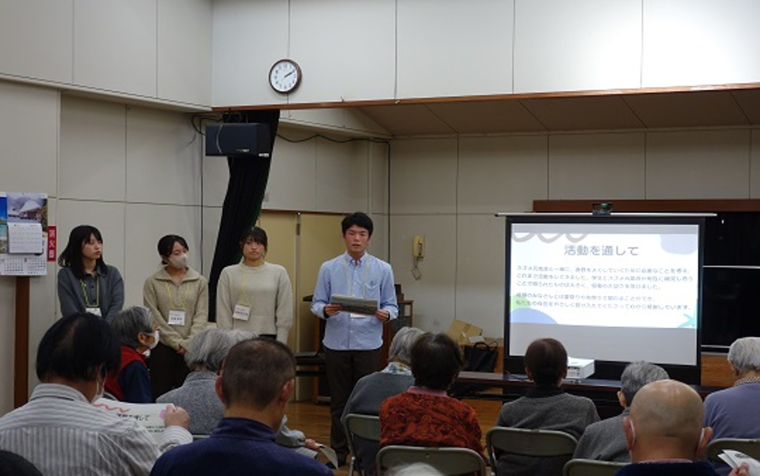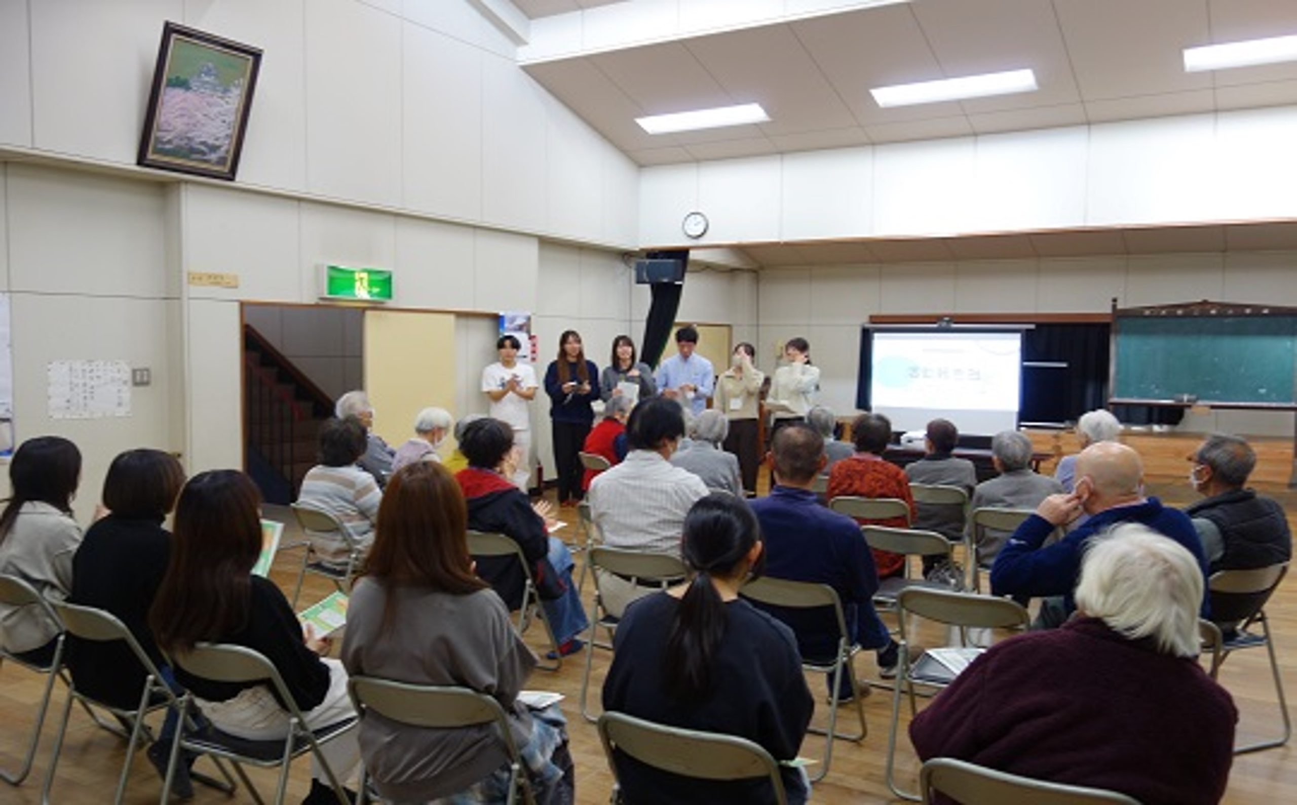 公民館に到着後、2・3年生は報告会の準備を行い、1年生は地域の高齢者の方々が取り組んでいる「いきいき百歳体操」に参加しました。地域の方々と一緒に体を動かすことで、実習地の雰囲気を肌で感じる時間となりました。
