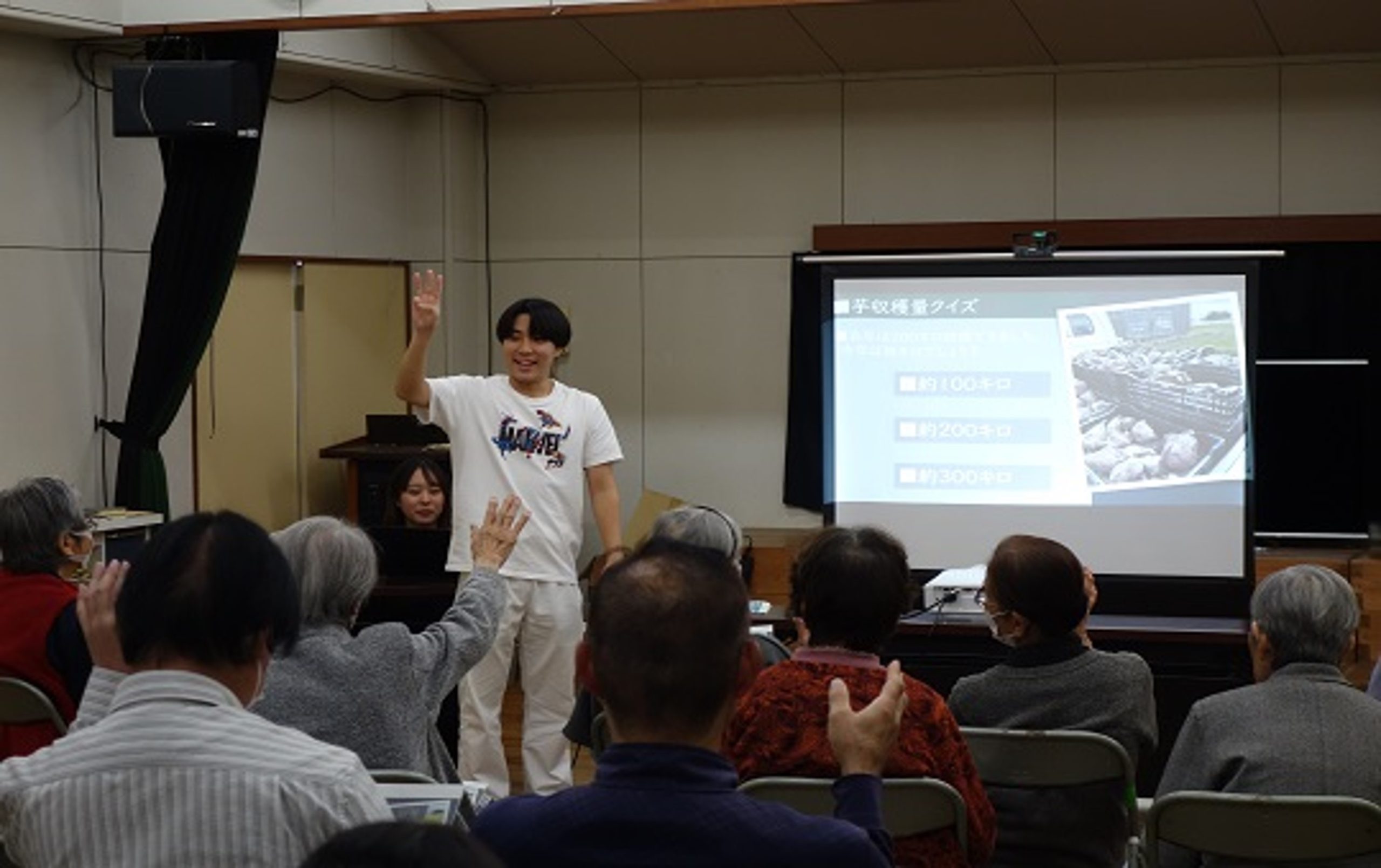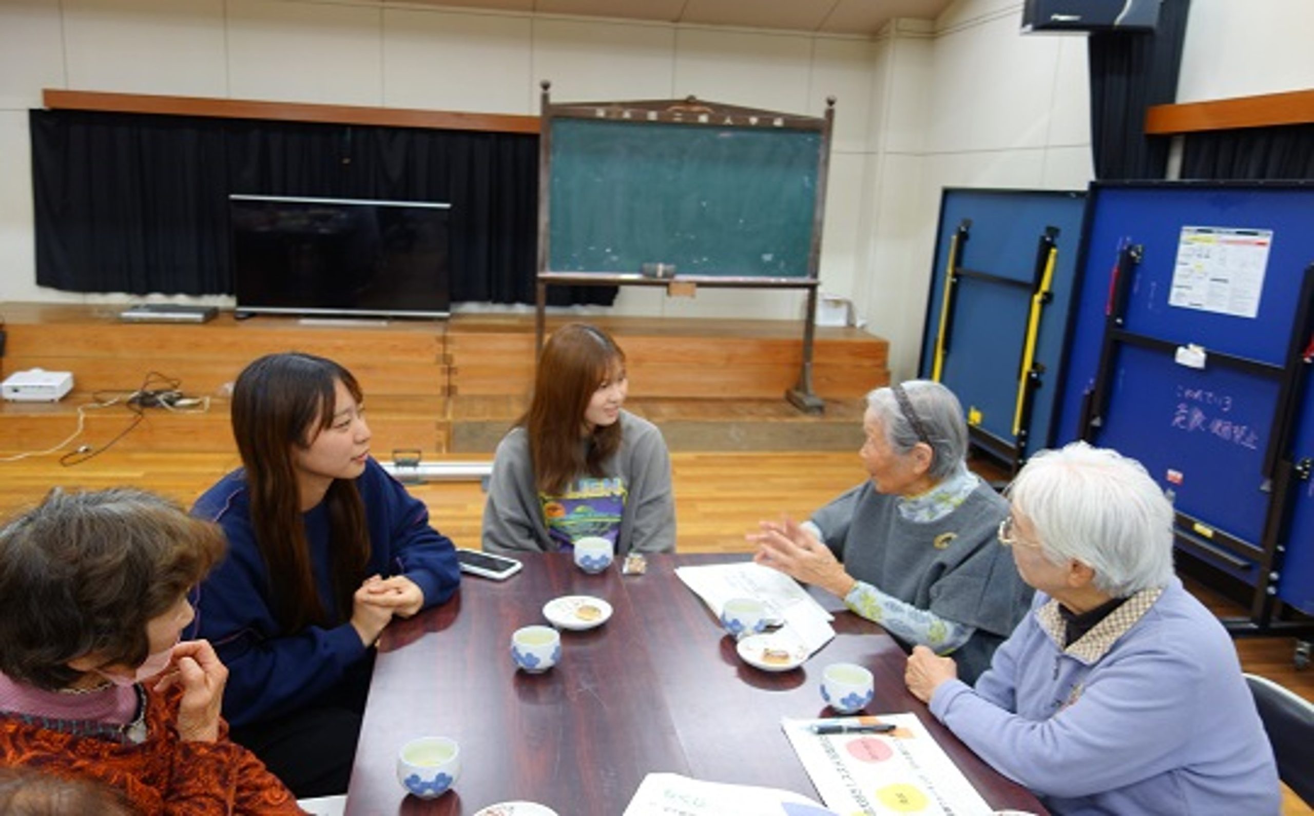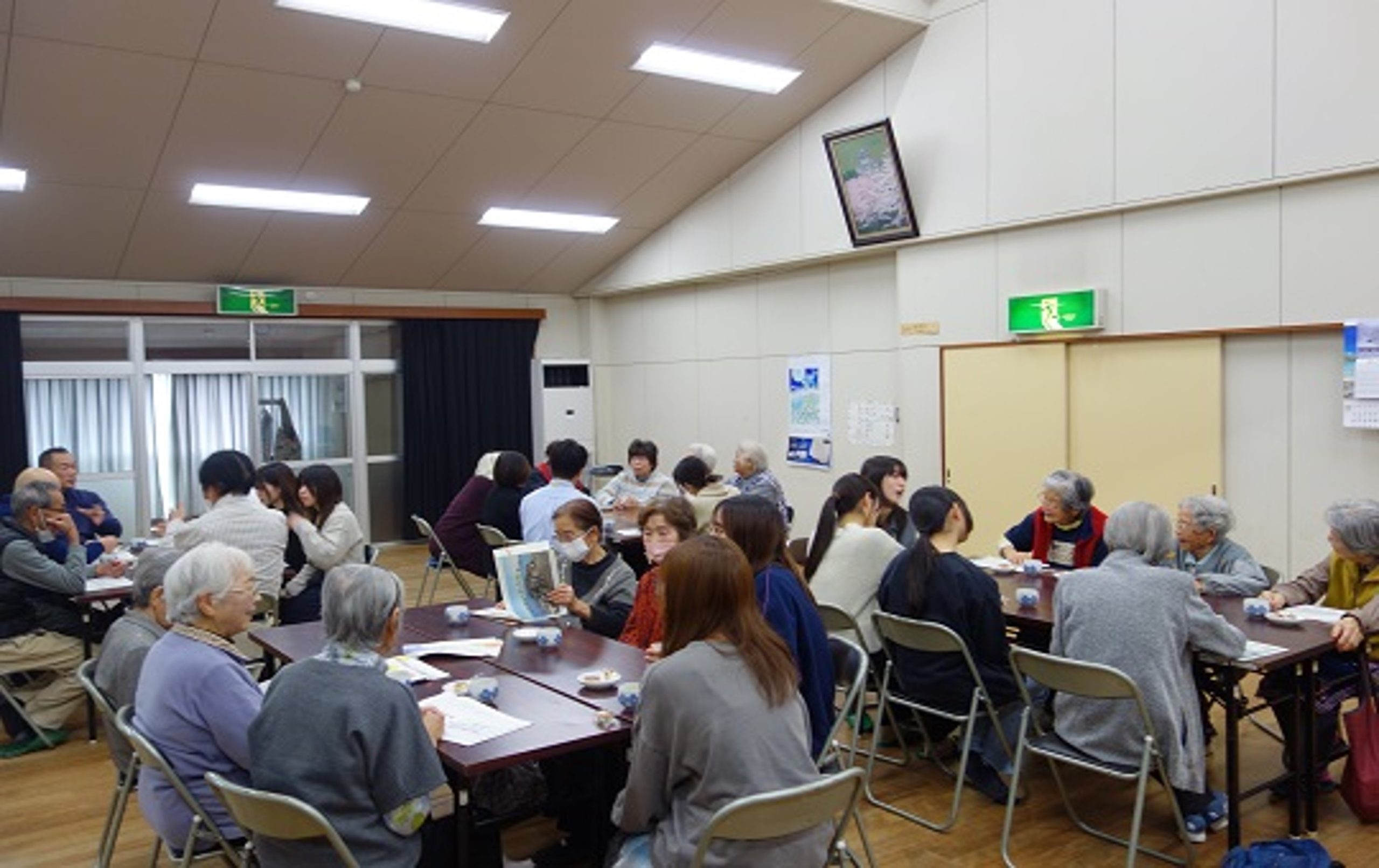 公民館に到着後、2・3年生は報告会の準備を行い、1年生は地域の高齢者の方々が取り組んでいる「いきいき百歳体操」に参加しました。地域の方々と一緒に体を動かすことで、実習地の雰囲気を肌で感じる時間となりました。