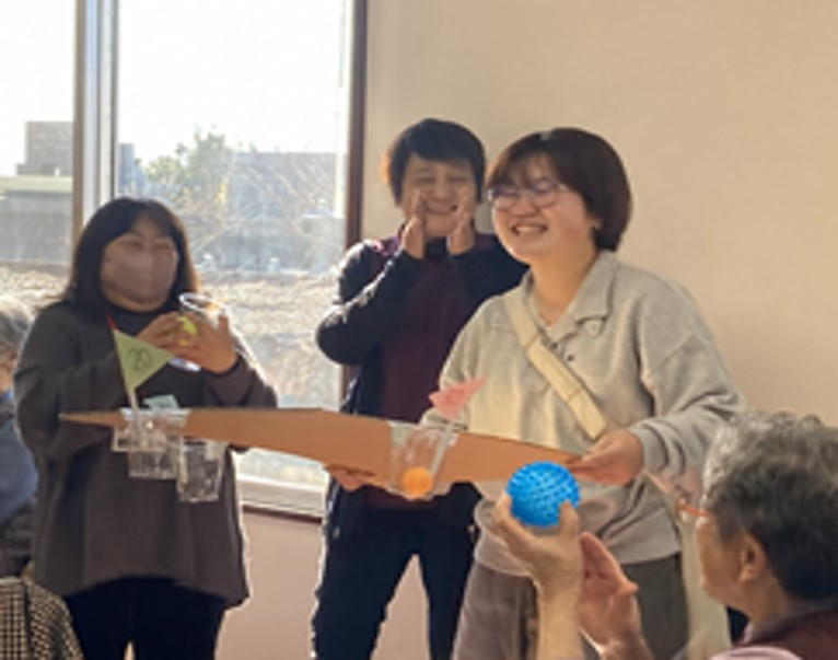 ほかにも、ピンポン玉を跳ねさせて狙った場所に入れるゲームや、ボールと紙皿を使ったカーリングやボウリングのような遊びが続きます。順番に挑戦する中で、見守る人たちが声援を送り、成功すれば拍手、失敗すれば励ましの声が飛び交う、あたたかな雰囲気が印象的でした。