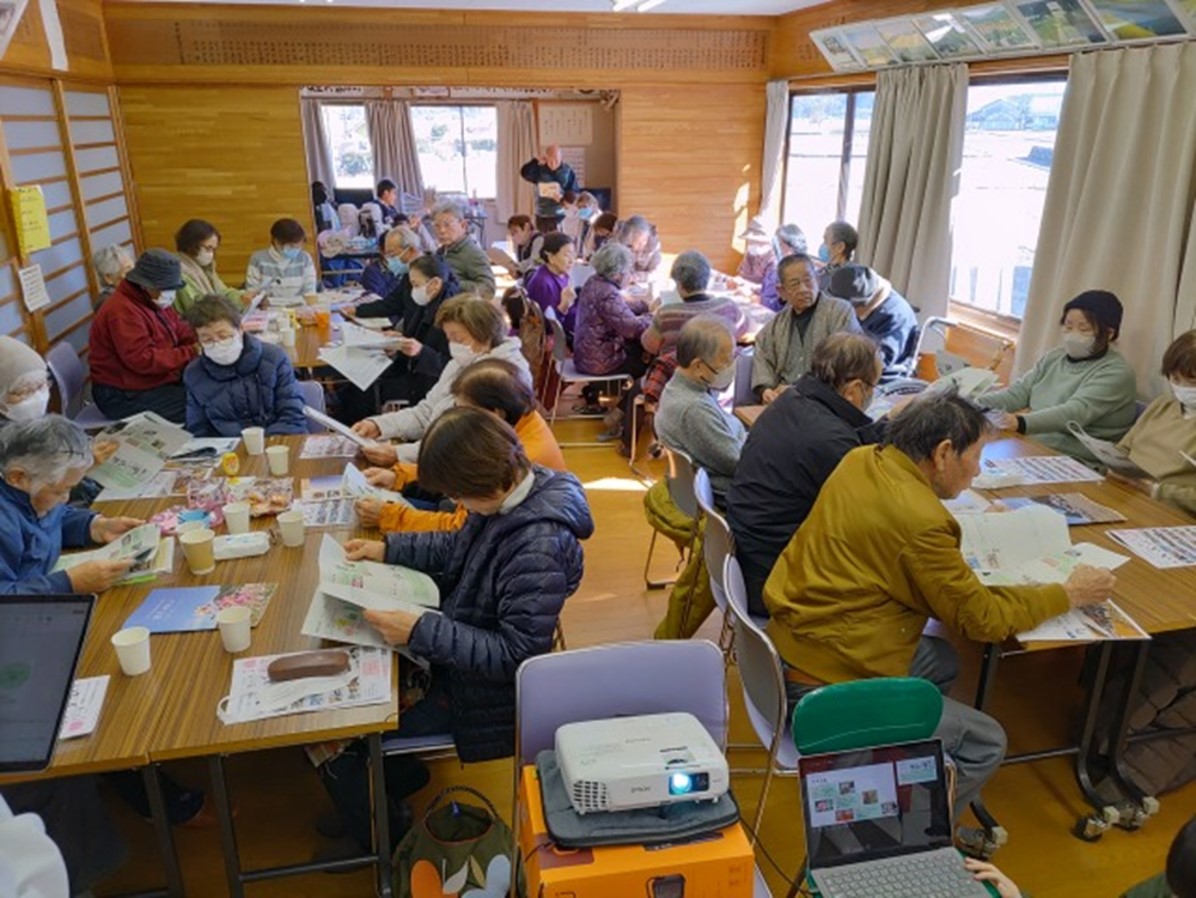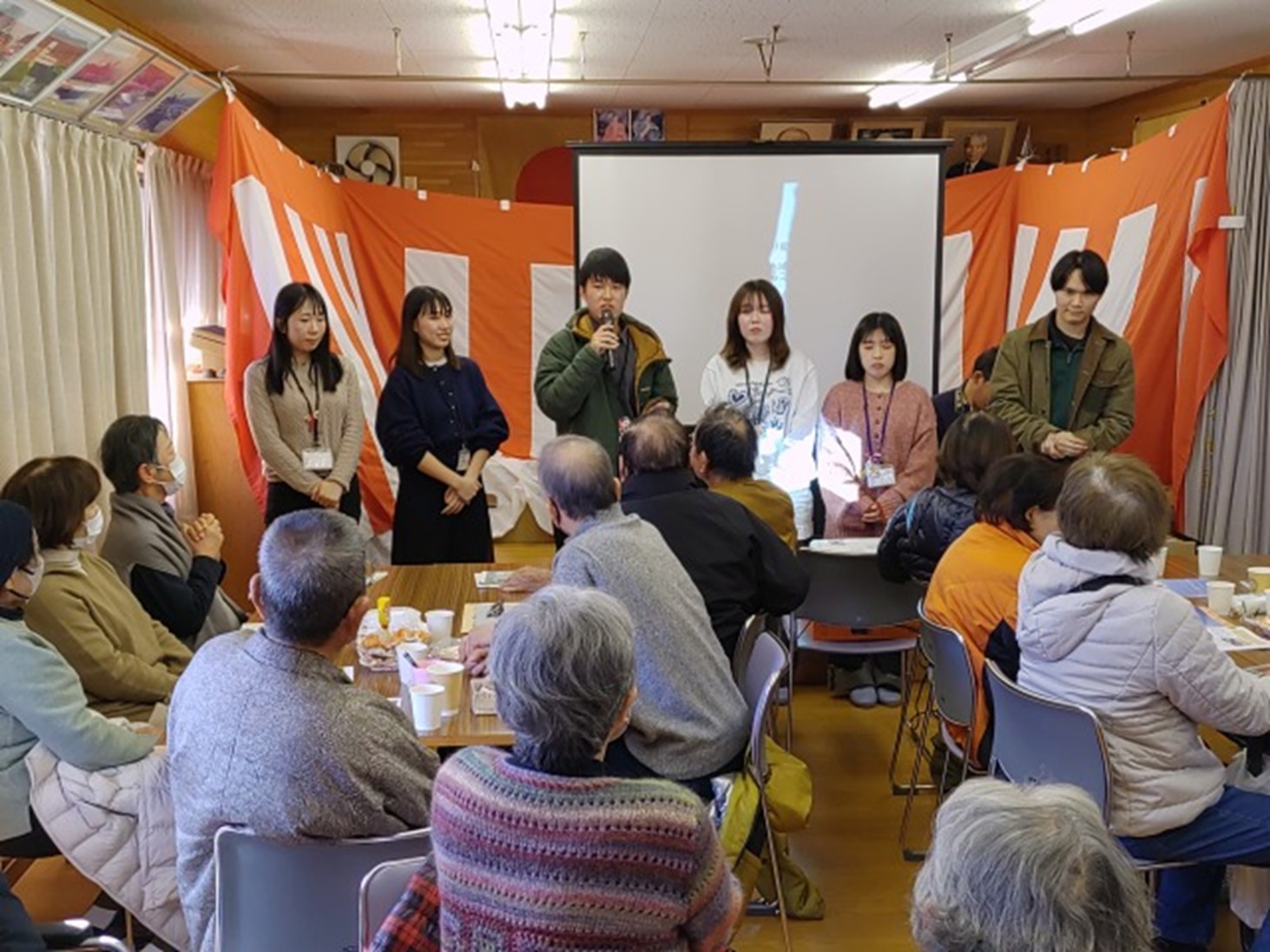 1月23日(金)、稲生ふれあいサロンにおいて、稲生実習班による現地報告会を開催しました。当日は、2年間にわたる実習の成果を報告するとともに、これまで取り組んできた「集落活動センターチーム稲生パンフレット(リニューアル版)」および「コミュニティブック 稲生を結ぶ」のお披露目を行いました。