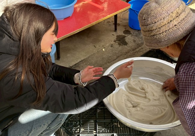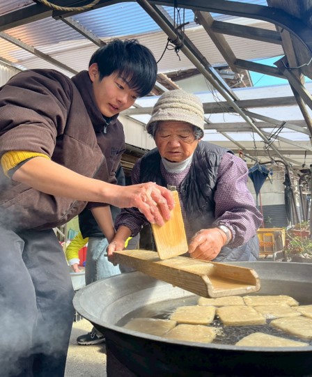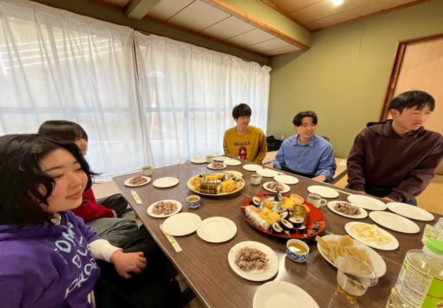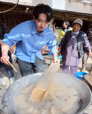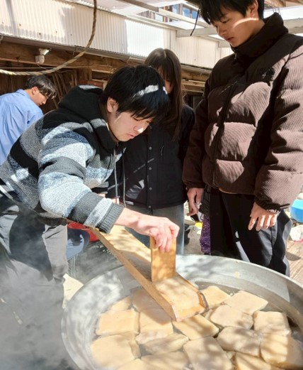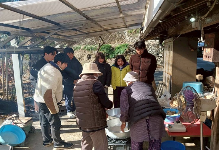 1月23日、黒潮町佐賀北部実習班は、地域での食に関する実習活動を行いました。本実習では、11月から棚田周辺の栽培場所の印付けなどの管理作業に取り組み、12月に収穫したコンニャク芋を用いて、地域の名人の方と一緒にコンニャクづくりを行いました。