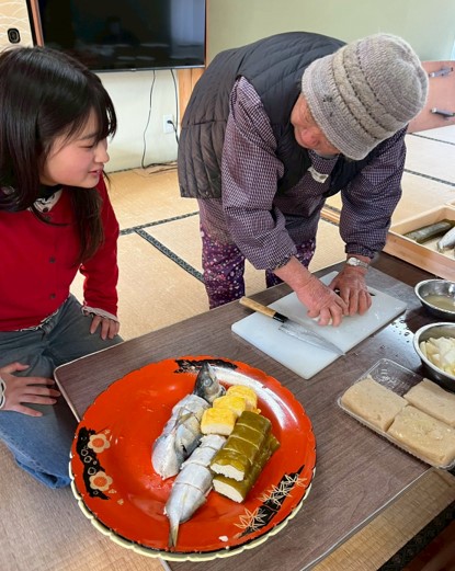 完成したコンニャクは刺身として味わったほか、サバの押し寿司など、皿鉢料理の盛り付けにも活用しました。また事前には、地域で採れたニラを使ったキムチや、ショウガやナンプラーを加えた料理などの試作を行い、地域の方々による試食も実施しました。