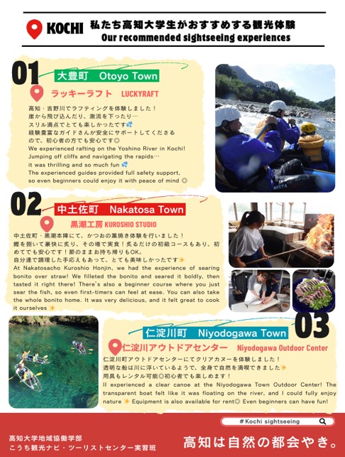 学生自身もその魅力を深く理解するため、これまで吉野川でのラフティング、カツオのタタキ作り体験、仁淀川でのクリスタルカヤックなどを実際に体験してきました。体験を通じて得た気づきや魅力を、英訳を加えたポスターにまとめ、学習成果報告会「チキョフェス」での発表を聴きに来てくださった実習地の方へお渡ししました。