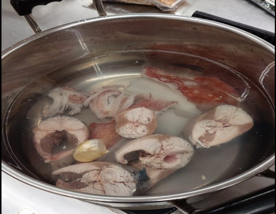 私たちは2月19日、「ソーレ」調理実習室にてラーメンの試作を行いました。今回は、ラーメンの味の基礎となる出汁に焦点を当て、鰹節、昆布、椎茸、魚(身やアラ)を用いて配合の検証を実施しました。魚は下処理を行い、身やアラから丁寧に旨味を引き出す工程を確認しながら煮出しました。