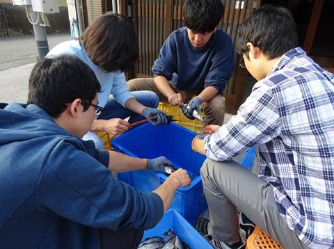 HOME > 学部からのお知らせ > 授業風景 > 地域協働マルシェの準備を一緒に!(1年生実習・いの町是友) 地域協働マルシェの準備を一緒に!(1年生実習・いの町是友) 授業風景2017年11月13日 11月3日、1年生いの町是友実習チームは、4日に予定されている高知大学ホームカミングデー・地域協働マルシェの準備を行いました。地域の方にご指導いただきながら、あめごの塩焼きの準備。アメゴの内蔵を割り箸で取る、串でうまい具体に刺すなど、見よう見まねで挑戦しました。また、3年生実習チームのBOIL増刊号の配布にも同行しました。 Tweet < 前のページヘ 次のページヘ > サイトマップ プライバシーポリシー