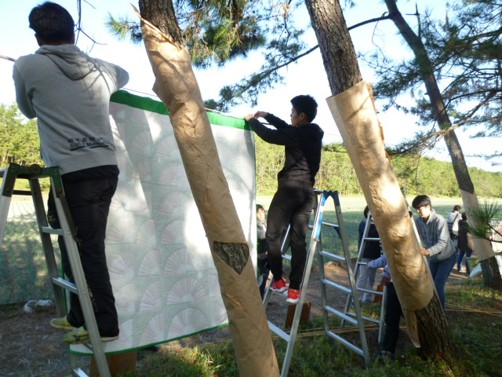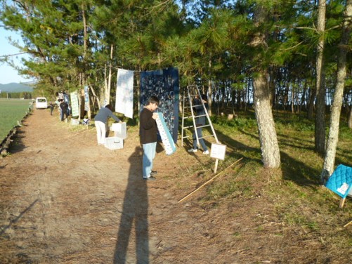 11月16日、3年生実習・黒潮町クラスホエールウォッチングデータバンク班は、黒潮町の入野松原に隣接した宮川公園で開催された「第25回潮風のキルト展」のお手伝いに行きました。この催しは、キルト展としては非常に珍しい、屋外展示のキルト展です。キルトの中には、屋外展示の光を意識して、光が透過する美しさを考えたキルトなど、風景との調和を考えた作品もあり、砂浜美術館ならではの特別なイベントになっています。屋外でキルトを展示するには、毎日、朝に展示し、夕方にはしまう作業が不可欠でもあり、15日~18日の開催期間中、土日を中心に日替わりのイベントも開催されるなど、実は、労力のかかるイベントでもあります。今回、ホエールウォッチングデータバンク班は、16日だけではありますが、ボランティアスタッフとして、当日の設営と片付けを中心としてお手伝いに行きました。この日は、イベントとして小学生を中心とした琴の演奏が行われましたが、その会場設営などもお手伝いしました。