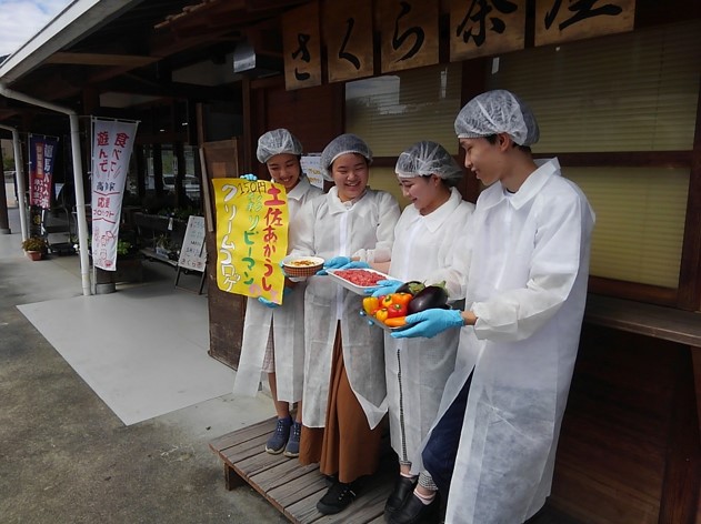 3年生実習エンジ四国班は、本山さくら市で地域の農産物を活用した新商品づくりに取り組んでいます。9月20日の実習では、16日に続き、2回目の新商品のテスト販売に取り組みました。土佐あかうしと彩りピーマンのクリームコロッケ、米粉グラタン、地元野菜(彩りピーマン、生姜)のかき揚げを前日から準備し、販売しました。また、お客さんにアンケートも行ない、食味などについて感想や意見を聞き取りました。販売終了後は、次回の販売(10月18日予定)の打ち合わせをパートナーさんと実施しました。