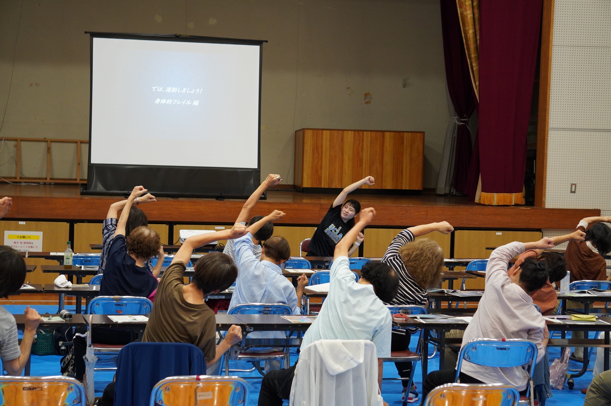 講座では,フレイルを予防するために,運動や身体活動を日頃から意識して取り組むことが重要であるという主旨のもと,座ってできるストレッチや筋トレ,また,運動と認知課題(例えば歩行しながら計算をする等)を組み合わせたコグニサイズの体験も行われました。