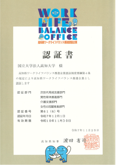 このたび高知大学は、「高知県ワークライフバランス推進認証企業」の認証を取得しました。