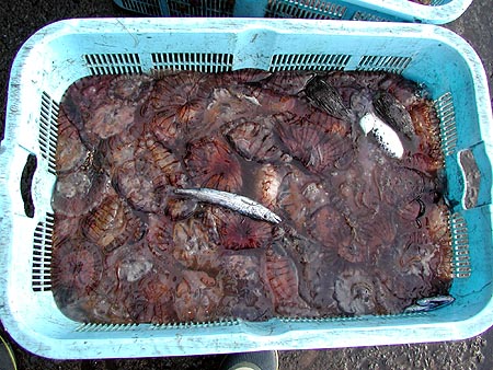 2004年4月22日・4月29日:室戸市東側で定置網を行っている漁港で採集を行いました.回った漁港は,室戸岬東側の高岡漁港(岬先端に近い),三崎漁港(深層水の研究所近く),椎名漁港,佐喜浜漁港です.また,帰りに室戸岬の土佐湾側にある室津漁港の釣りの水揚げと鮮魚店を見ました.