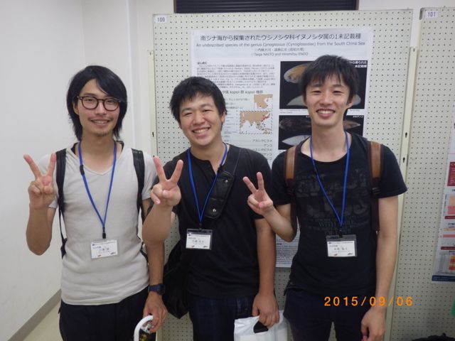 2015年9月4日〜7日 奈良市の近畿大学農学部で行われた日本魚類学会年会に参加しました. 最寄り駅から歩いて40分ぐらい... 水町君は日本産イタチウオ属について口頭発表しました ポスター会場で 三澤君はガンギエイ科コモンカスベに関するポスター発表 内藤君は南シナ海産のイヌノシタ属に関するポスター発表