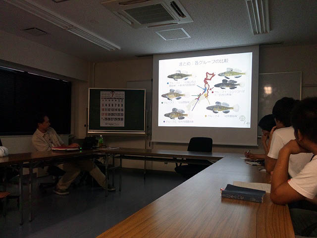 2011年7月28日:兵庫県の灘中学校・灘高等学校の生物部が,夏合宿(四万十川での採集等)の一環として本研究室を訪問しました.理学部1号館の展示と魚類標本室を見学し,ハゼ類や深海魚を中心に多数の標本を紹介しました.また,リクエストのあった「ハゼの多様性と分類」と「四万十川の魚類」についてセミナーを行いました.(遠藤,中山,朝岡)