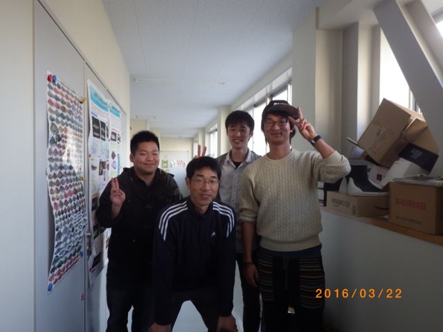 2016年3月22日:昨年度の卒業生4名が研究室を訪れました:秋永豪さん(琉球大院理工),鵜飼拓哉さん(アルソック),細井舜也さん(土佐塾中学校・高校),水町海斗さん(北海道大学院理).北は北海道から南は沖縄まで.写真1・写真2・写真3 ・写真4