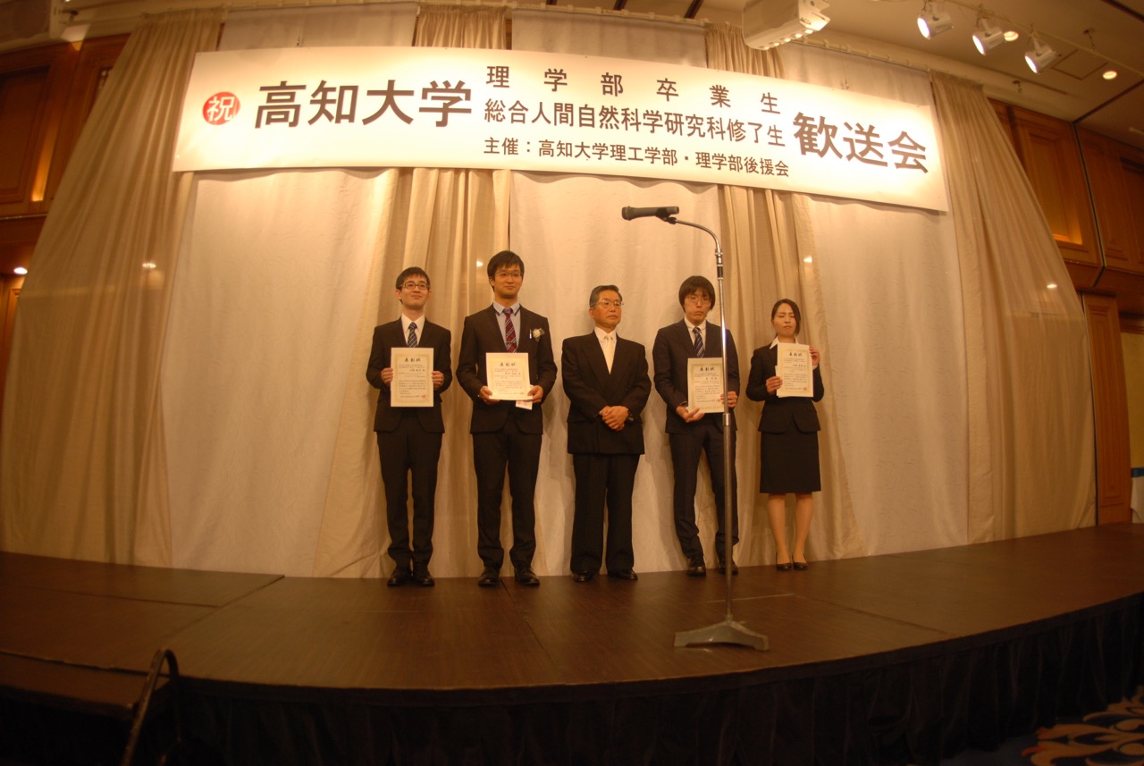 2019年3月22日:大学院の修了式と学部の卒業式が行われました(修士4名,学部10名).昼は三翠園で理学部後援会主催の歓送会があり,上阪君が修士論文で南溟会賞を受賞しました.夜は研究室の追い出しコンパでした.