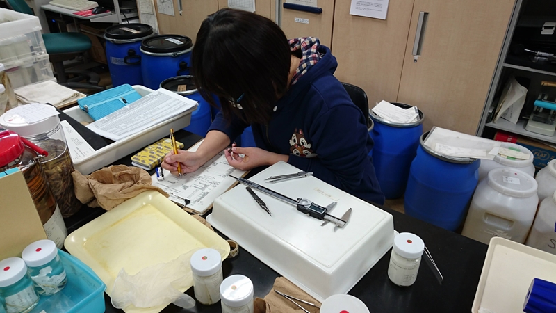 2019年3月6−8日:OBの三澤遼さん(京都大)が標本調査のため研究室に滞在しました.今月で「ガンギエイ目魚類の集団構造に関する研究」で博士の学位を取得し,4月からは東北区水産研究所八戸支所に移ります. 写真